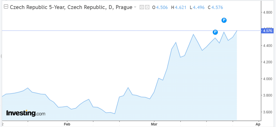 Ačkoliv meziměsíční statistiky ukazují březnový průměr 5 letých úrokových sazeb na úrovni 3,57 %, což je pokles oproti únoru, realita posledních dní je opačná. Po prudkém propadu na začátku měsíce začaly sazby v druhé polovině března strmě růst. Tento 'vnitro-měsíční' výkyv je důvodem, proč banky v těchto dnech nečekaně zastavují slevové akce, a dokonce přistupují ke zvyšování úrokových sazeb.